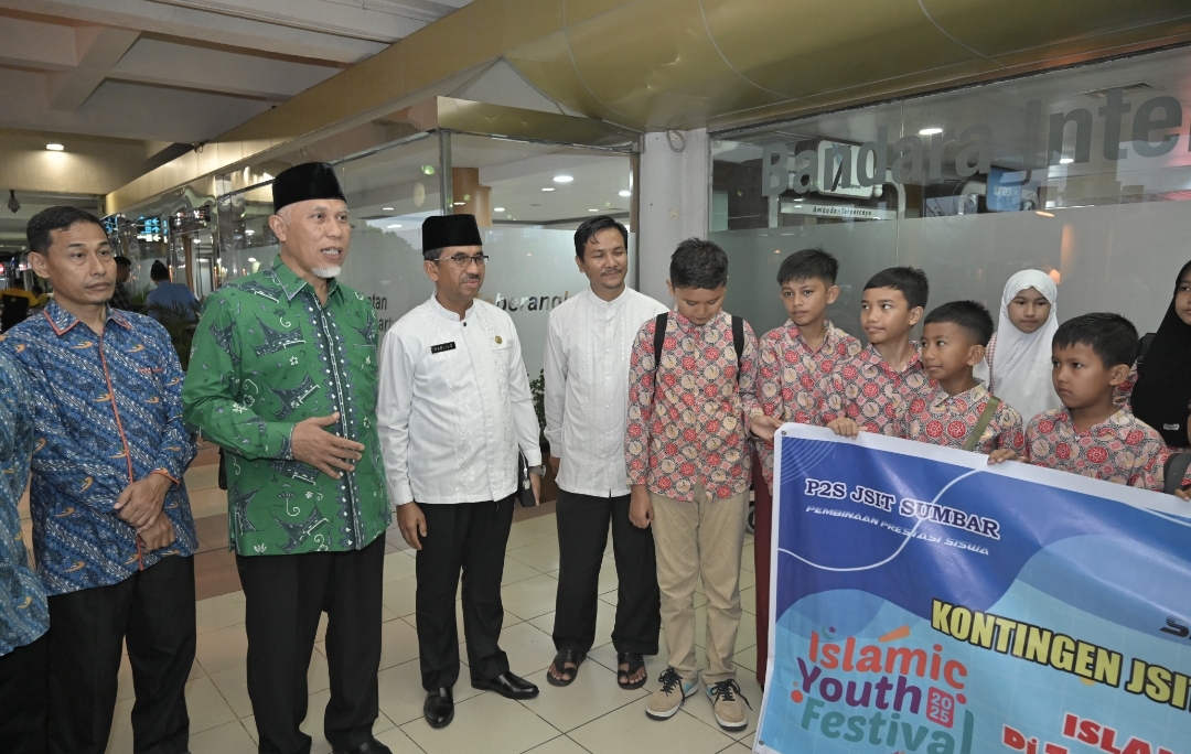 SUMBAR, RELASI PUBLIK–Gubernur Sumatera Barat (Sumbar), Mahyeldi Ansharullah, melepas 22 pelajar Sekolah Dasar (SD) Kontingen Jaringan Sekolah Islam Terpadu (JSIT) Sumbar, yang akan mengikuti perlombaan pada Islamic Yout Festival di Jakarta, Jumat (14/02/2025) di Bandara Internasional Minangkabau (BIM).