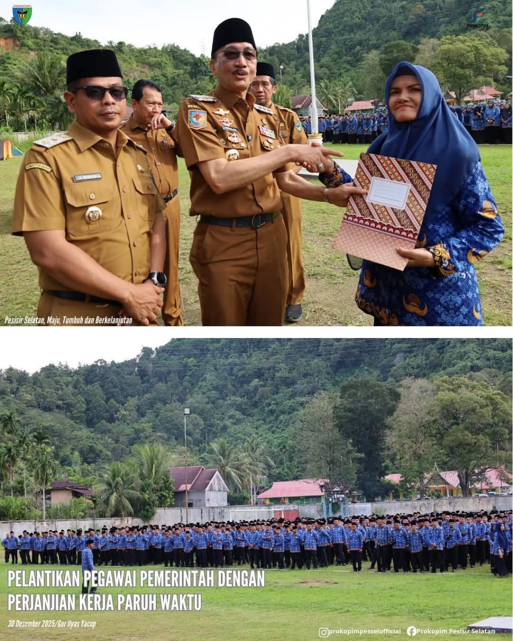 PAINAN, RELASI PUBLIK – Suasana haru menyelimuti GOR Ilyas Yacub Painan, Selasa (30/12/2025), saat Pemerintah Kabupaten Pesisir Selatan secara resmi melantik dan mengambil sumpah jabatan 4.191 Pegawai Pemerintah dengan Perjanjian Kerja (PPPK) paruh waktu.