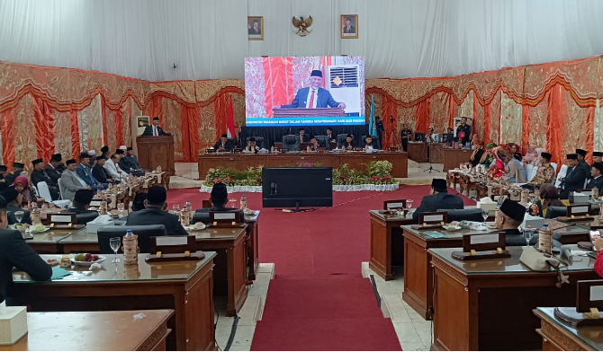 PASAMAN BARAT, RELASI PUBLIK — Gubernur Sumatera Barat (Sumbar), Mahyeldi Ansharullah menghadiri Rapat Paripurna peringatan Hari Jadi ke-22 Kabupaten Pasaman Barat (Pasbar) yang digelar di Ruang Rapat Paripurna DPRD Pasbar, Rabu (7/1/2026).