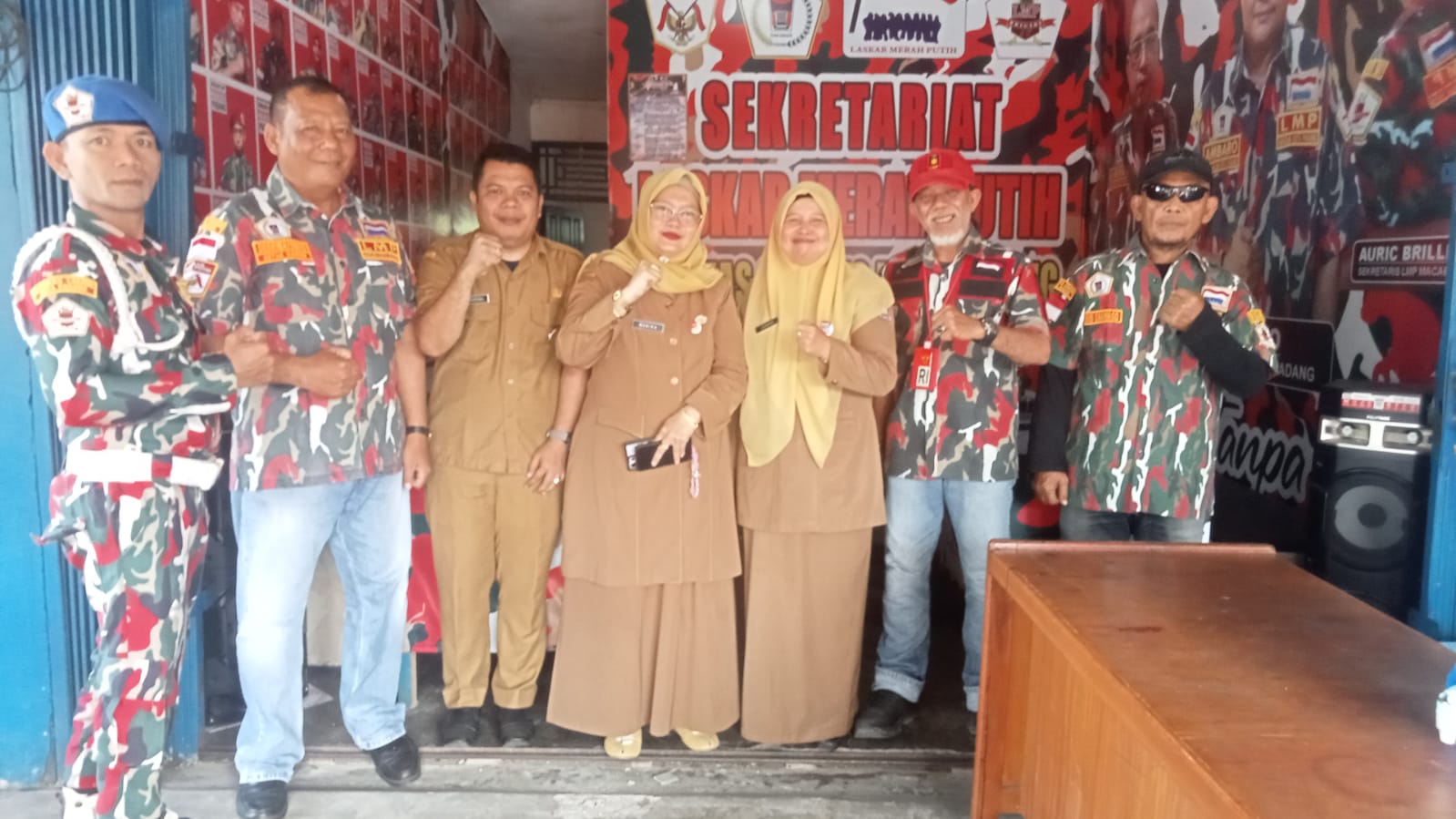 Dinas Kesbangpol Kota Padang yang diwakili oleh staf Hansbake dan Ormas, diantaranya Leoneva, Monika, dan Sony Kardinal bersama Ketua Harian serta jajaran LMP Markas Cabang Kota Padang. (Dok. Komdigi LMP Kota Padang )