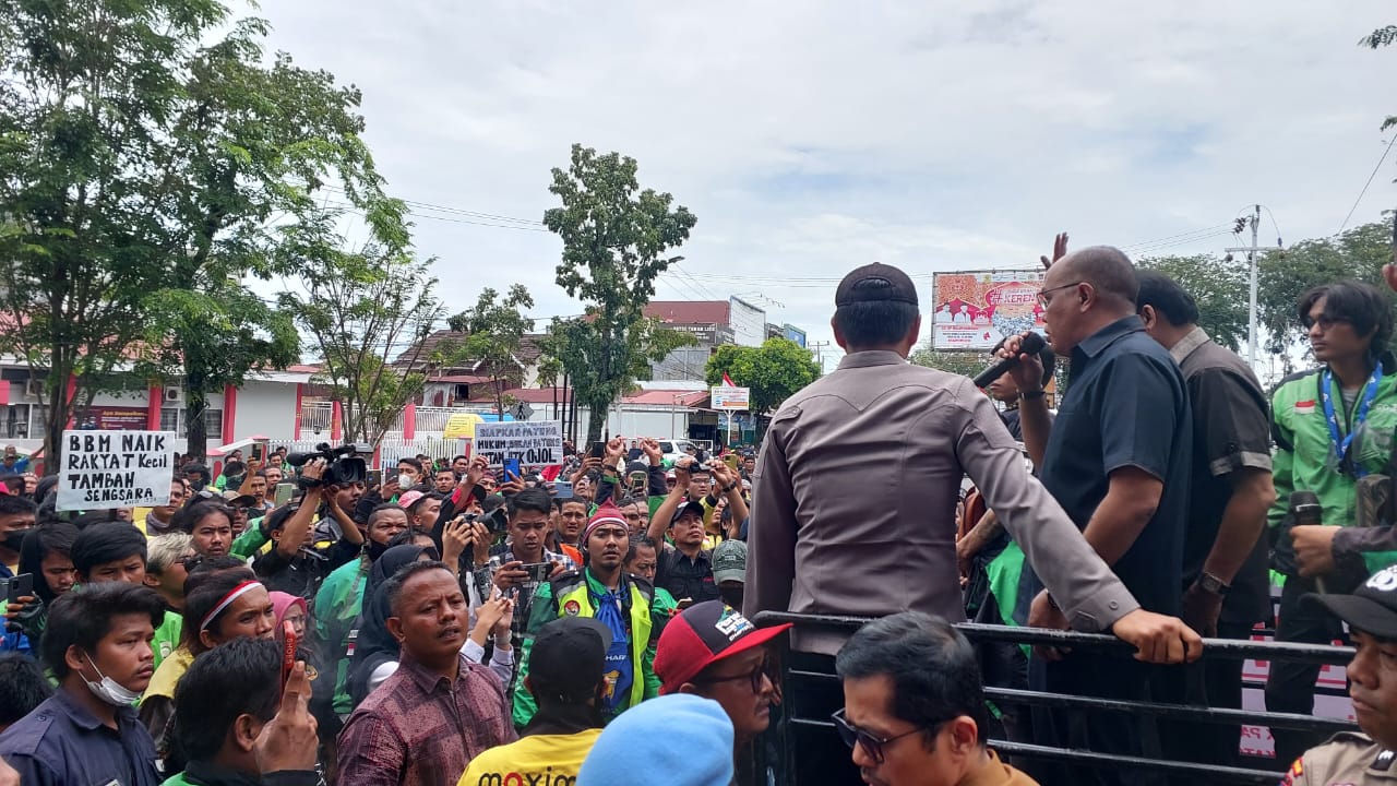 Ratusan driver ojek online di Sumbar melakukan aksi unjuk rasa di kantor DPRD Sumbar, Selasa (13 September 2022).** Foto dok/dewi