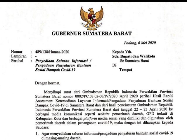 “Seluruh data penerima bantuan langsung tunai, Jaring Pengaman sosial, program keluarga harapan, penerima kartu prakerja, dan lain lain, agar dipajang dan ditempelkan di kantor kantor kecamatan sampai ke nagari dan jorong serta tempat tempat strategis lainnya yang bisa diakses masyarakat termasuk menginformasikannya melalui media sosial dan website resmi pemerintah,” bunyi salah satu poin dalam surat arahan tertanggal 6 Mei 2020 tersebut.