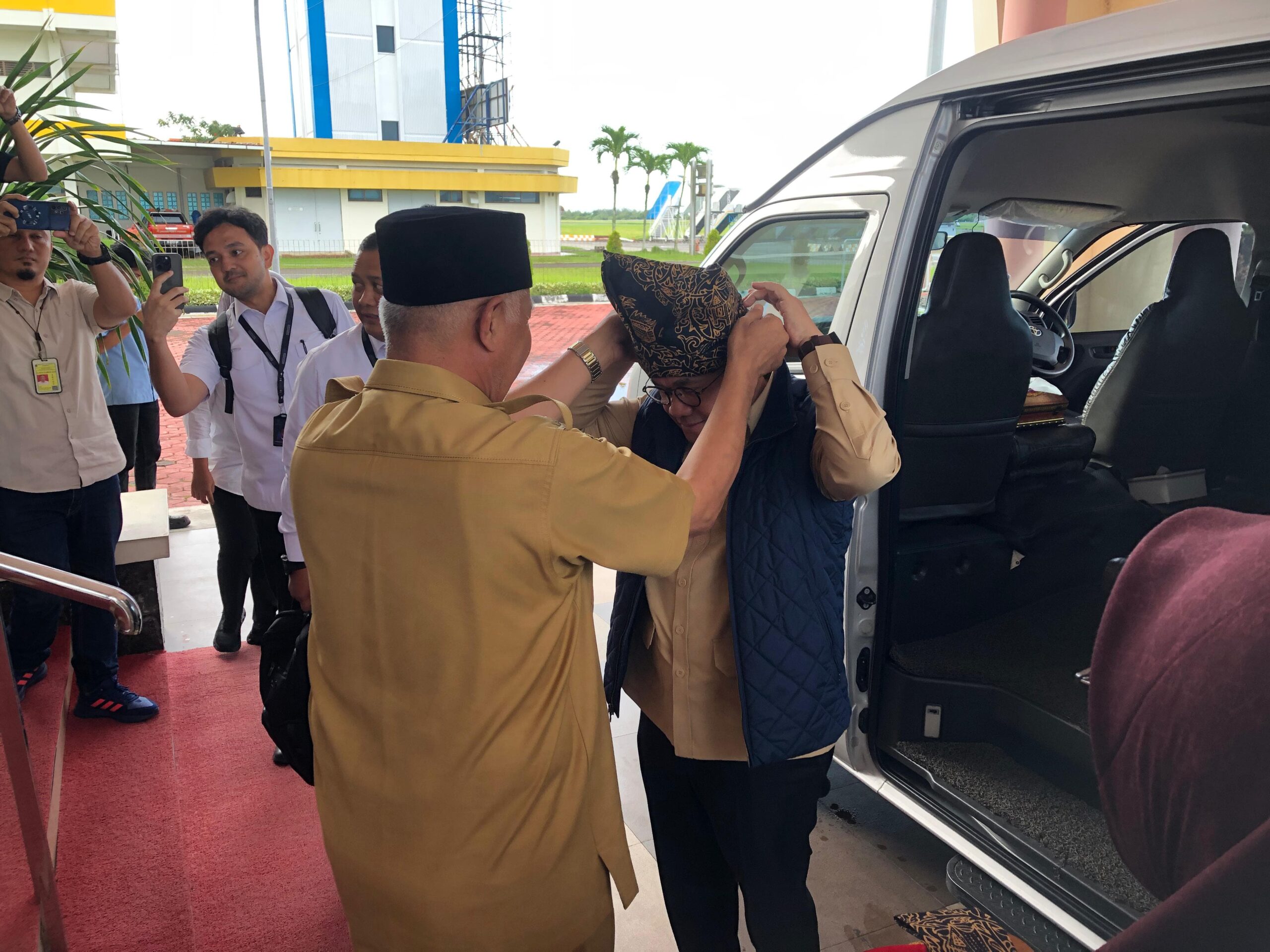 SUMBAR, RELASI PUBLIK — Gubernur Sumatera Barat (Sumbar), Mahyeldi Ansharullah menyambut kedatangan Menteri Perdagangan (Mendag) Republik Indonesia, Budi Santoso dengan pemasangan deta di VIP Bandara Internasional Minangkabau (BIM), Selasa (18/11/2025).
