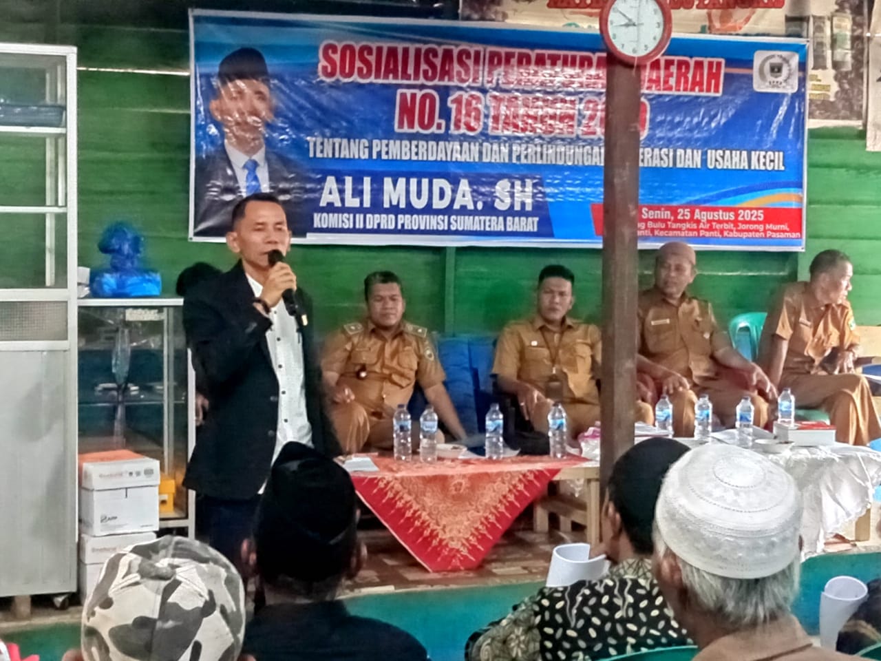 PASAMAN, RELASI PUBLIK – Anggota DPRD Sumbar dari Dapil Pasaman-Pasaman Barat Ali Muda SH menggelar sosialisasi Peraturan Daerah No 16 Tahun 2019, Tentang pemberdayaan dan perlindungan koperasi dan usaha kecil.
