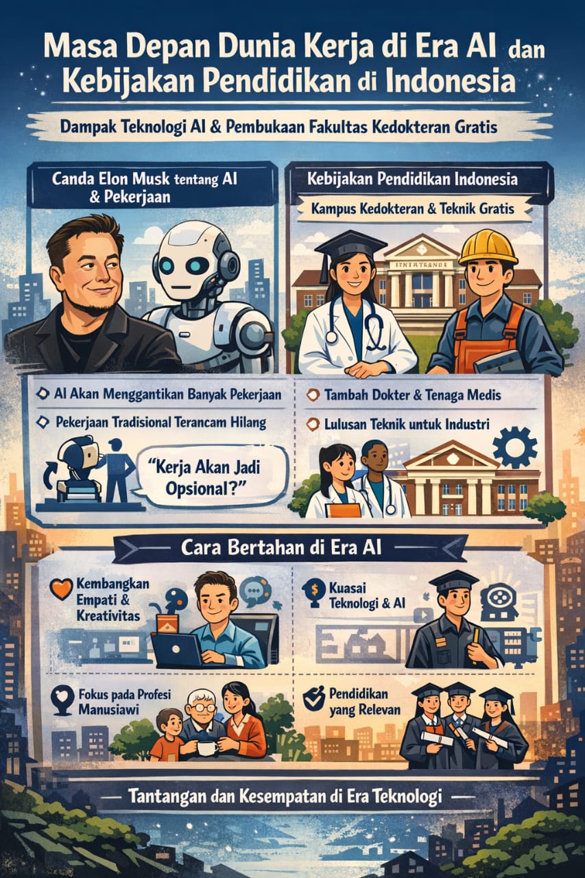 Di tengah perubahan tersebut, muncul pernyataan-pernyataan futuristik dari tokoh teknologi dunia seperti Elon Musk. Ia menyampaikan pandangan bahwa dalam beberapa dekade ke depan, AI dan robot berpotensi menggantikan sebagian besar pekerjaan manusia, bahkan menjadikan kerja sebagai sesuatu yang “opsional”. Di sisi lain, pemerintah Indonesia justru mengambil langkah yang tampak berlawanan dengan narasi tersebut, yakni membuka akses pendidikan tinggi, terutama di bidang kedokteran dan teknik, dengan skema pembiayaan negara.
