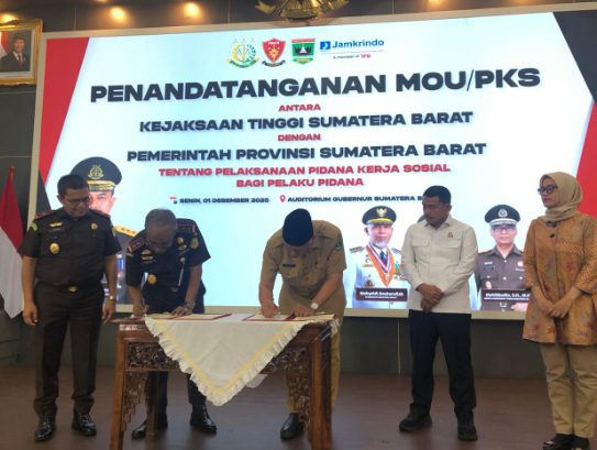 SUMBAR, RELASI PUBLIK — Pemerintah Provinsi Sumatera Barat (Sumbar) menjalin kerja sama tentang pelaksanaan kerja sosial bagi pelaku tindak pidana dengan Kejaksaan Tinggi Sumbar. Penandatanganan MoU kerjasama tersebut berlangsung di Auditorium Gubernuran, Senin (1/12/2025).