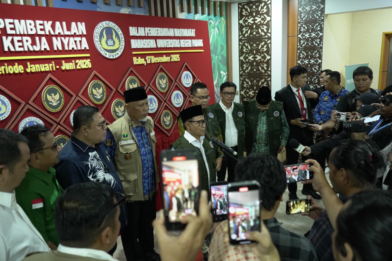 SUMBAR, RELASI PUBLIK — Gubernur Sumatera Barat (Sumbar), Mahyeldi Ansharullah mendampingi Menteri Koordinator Bidang Pemberdayaan Masyarakat Republik Indonesia, Abdul Muhaimin Iskandar dalam kegiatan pembekalan sekaligus pelepasan lebih dari 3.000 mahasiswa Universitas Negeri Padang (UNP) yang akan mengikuti Kuliah Kerja Nyata (KKN) periode Januari–Juni 2026 di wilayah terdampak bencana. Kegiatan tersebut digelar di Auditorium UNP, Rabu (17/12/2025).