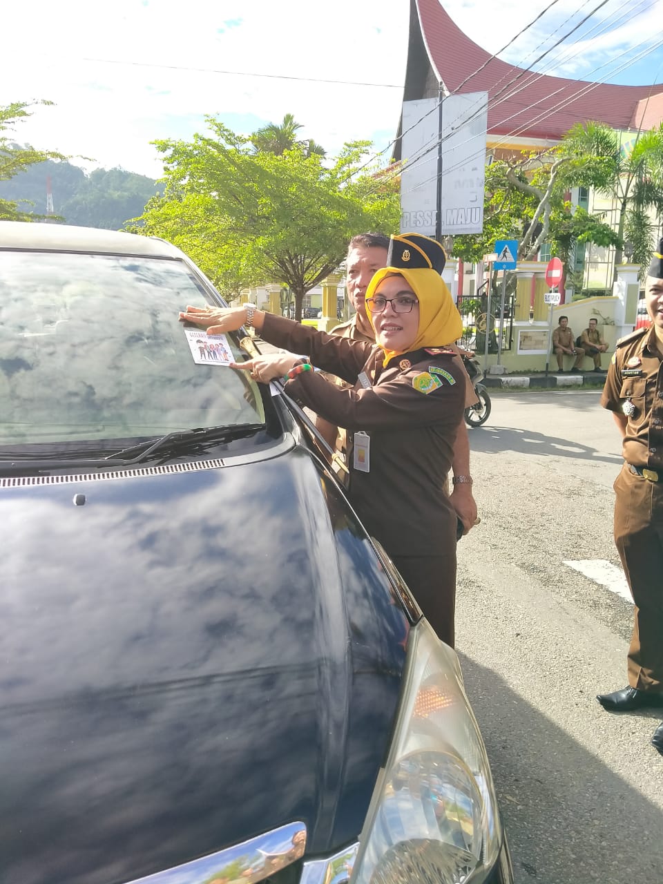 Sebelum aksi bagi – bagi stiker, pagi itu di peringati upacara di halaman Kejari Pessel, dipimpin langsung Inspektur Upacara Yeni Puspita, S.H MH. Dan diikuti Kacabjari Balai Selasa para Kasi dan Kasubagbin, Kasubsi, Jaksa Fungsional dan seluruh Pegawai Tata Usaha dari Kejari Pesisir Selatan dan Cabjari Balai Selasa, Honorer dan Security.