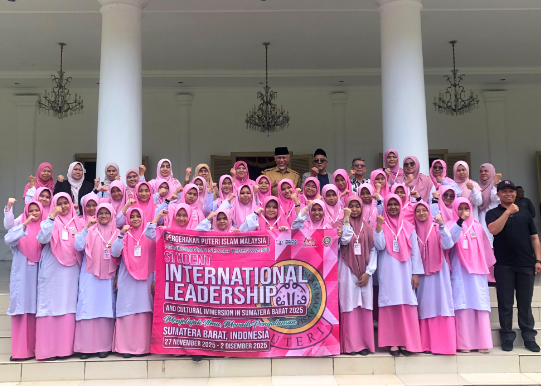 Gubernur Sumbar, bersama Pergerakan Puteri Islam Malaysia (PPIM) Perhubungan Negeri Terengganu yang tengah mengikuti Program Pertukaran Pelajar Antarbangsa di Sumbar, Selasa (2/12/2025).