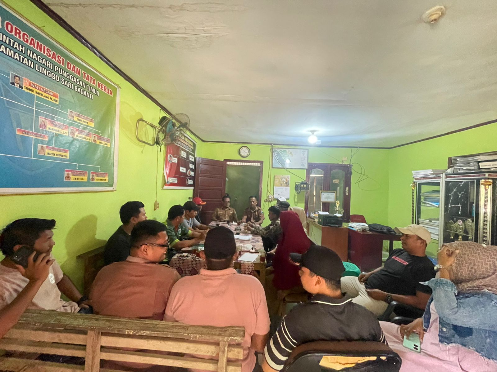 Penjabat Walingari, Tamizi Lameri, Amd, Pk.SKM, memimpin rapat didampingi oleh Ketua Bamus Nagari, Syamsul, dan Sekretaris Nagari, Zainul Aripin.