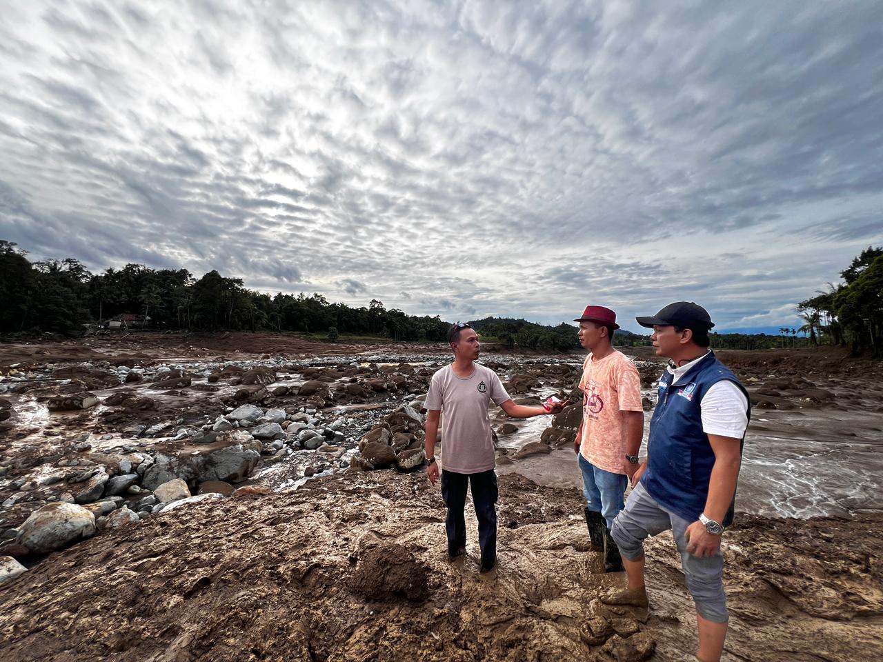 Anggota DPRD Sumbar, Ridwan,Dt. Tumbijo saat melakukan peninjauan serta evakuasi korban bencana banjir galodo di Kecamatan Palembayan, Kabupaten Agam, pada Jumat (28/11/2025).