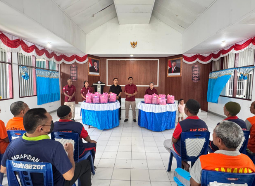 Kepala Rutan Ambon, Yudhy Rizaldy yang didampingi sejumlah petugas Rutan Ambon menyerahkan bantuan vitamin kepada perwakilan warga binaan lansia. (Dok. R)
