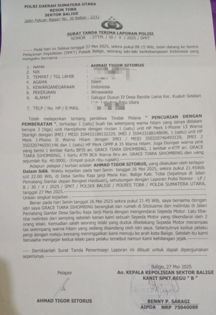 Kasus ini telah dilaporkan di SPKT Polsek Balige /Pores Toba pada Selasa 27 Mei 2025 dengan nmr Laporan : STTPL/ 30 / 5 / 2025 / SPKT. Dan menurut Grace Tiara Sihombing, korban perampokan kepada media ini mengatakan, hingga saat ini nomor petugas yang menerima laporan dipolres Toba susah dihubungi untuk menanyakan kelanjutan kasus ini.
