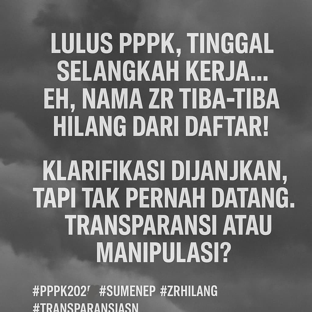Padahal, Nama ZR sebelumnya telah muncul dalam pengumuman resmi kelulusan, dan bahkan telah diminta mengisi riwayat hidup, akan tetapi nasip berkata lain, tiba tiba nama ZR hilang saat akan memasuki tahapan terakhir dalam seleksi kompetensi PPPK Sumenep.